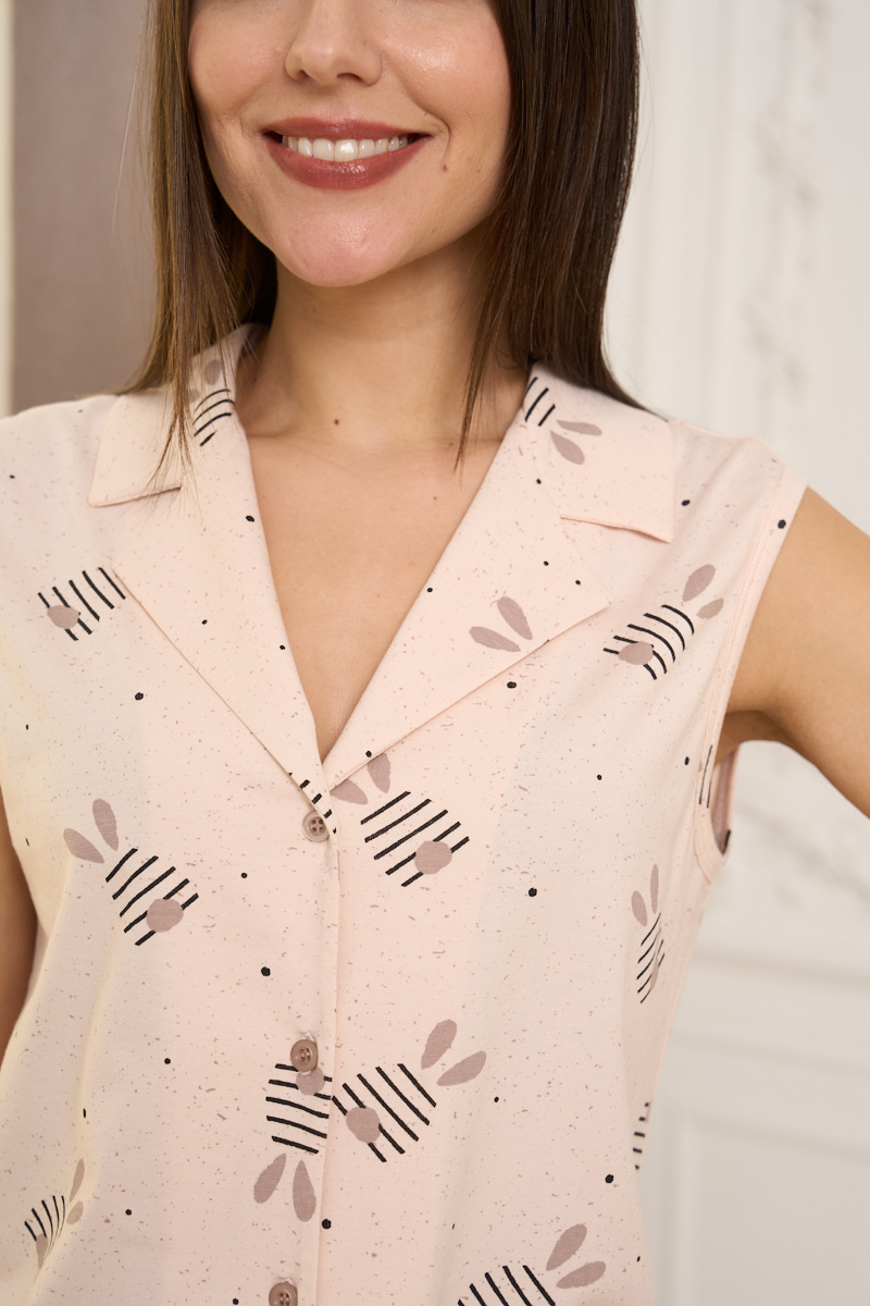 Рубашка прямого, свободного силуэта без рукавов. Плечо слегка спущено. Английский воротник, застежка центральная, на пуговицах. Низ изделия закругленной формы.