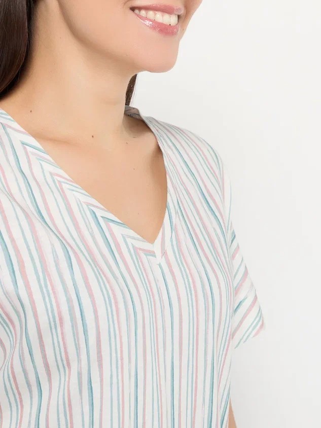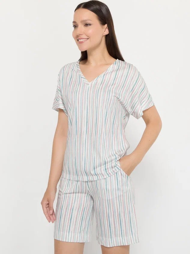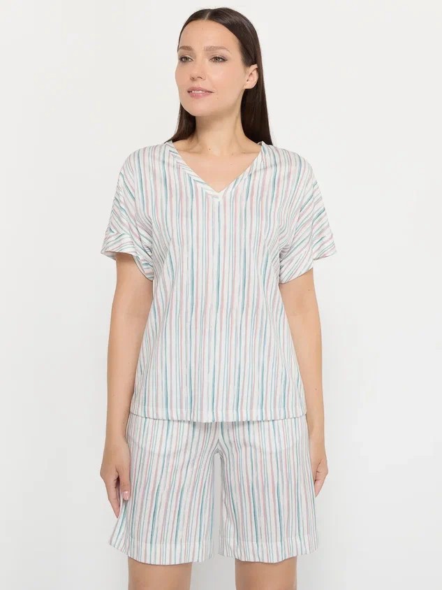 Верх комплекта – свободная футболка с V-образным вырезом, цельный рукав. Длина футболки в 70 см идеально сочетается с шортами, создавая гармоничный и сбалансированный образ. V-образный вырез деликатно подчеркивает линию шеи, придавая образу женственности и изящества.