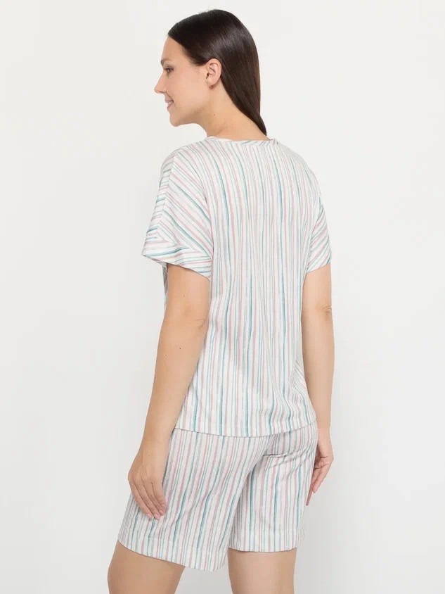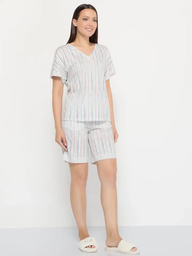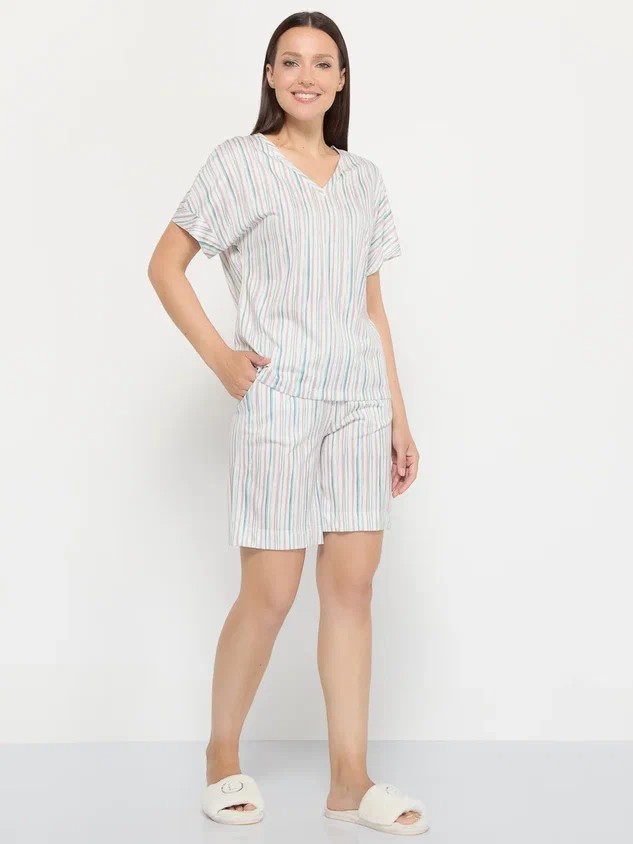 Пижама в вертикальную полоску – это ода расслабленности и домашнему уюту, облаченная в элегантную форму. Удлиненные шорты, длиной 48 см, – это не просто элемент одежды, это символ свободы движения и легкости. Практичные карманы добавляют образу функциональности и небрежного шарма, позволяя держать под рукой самые необходимые мелочи. Вертикальная полоска, словно тонкие нити дождя, визуально вытягивает силуэт, придавая фигуре стройность и грацию.
