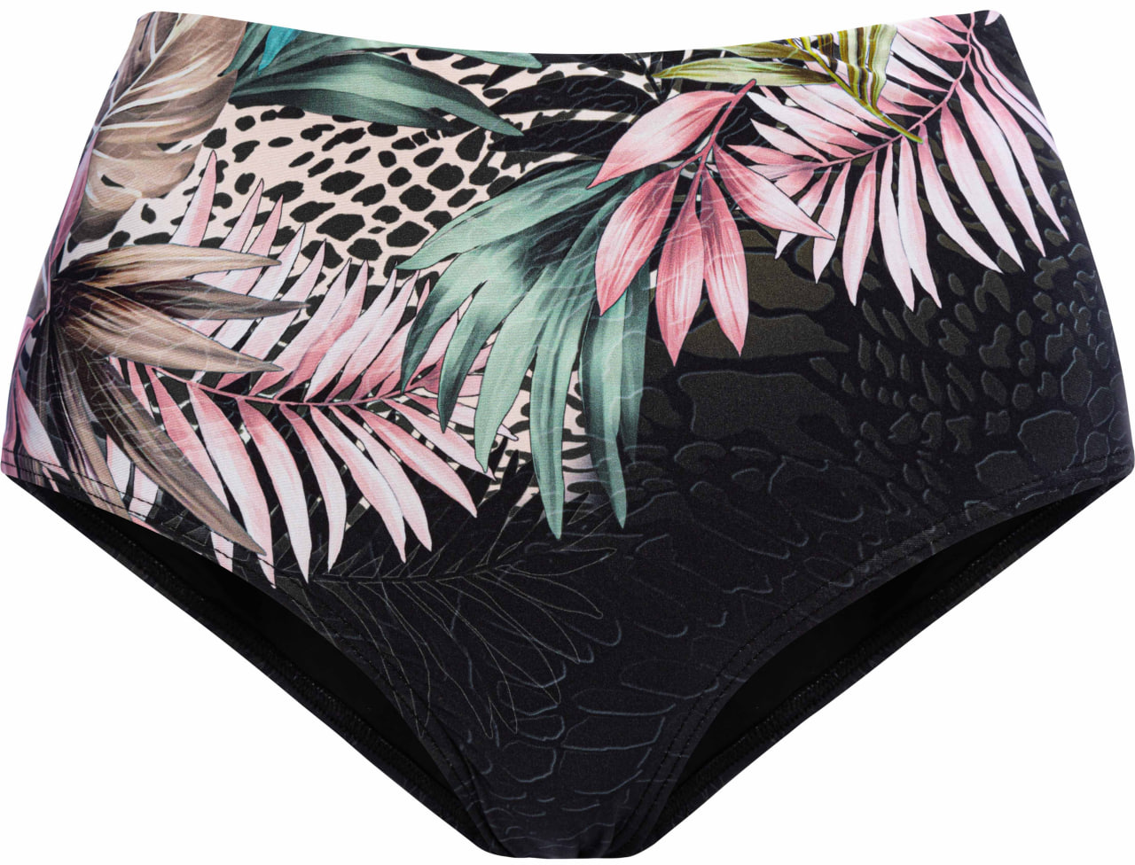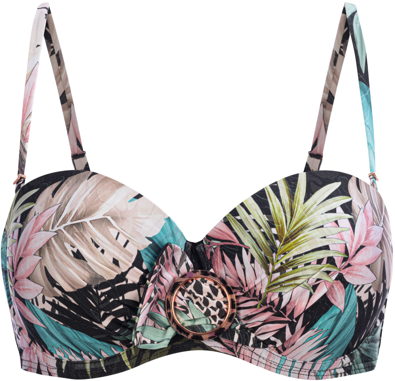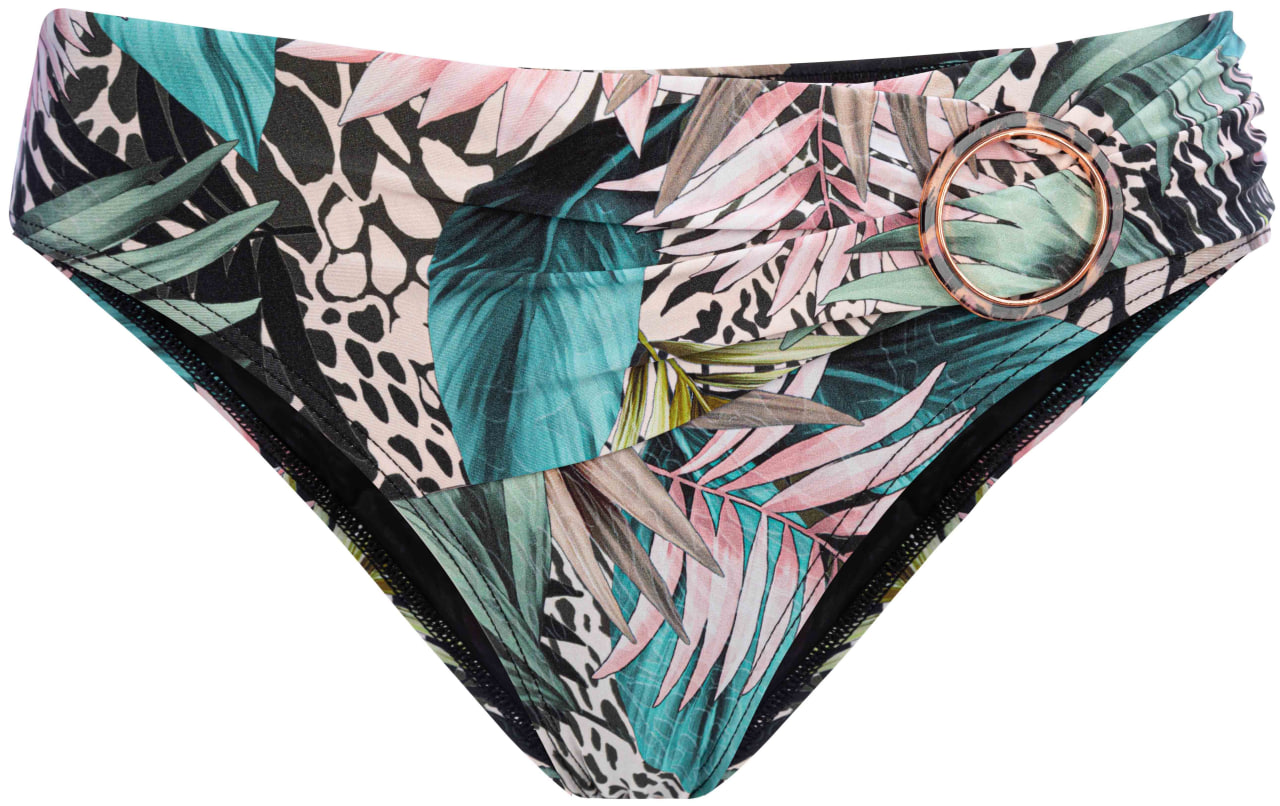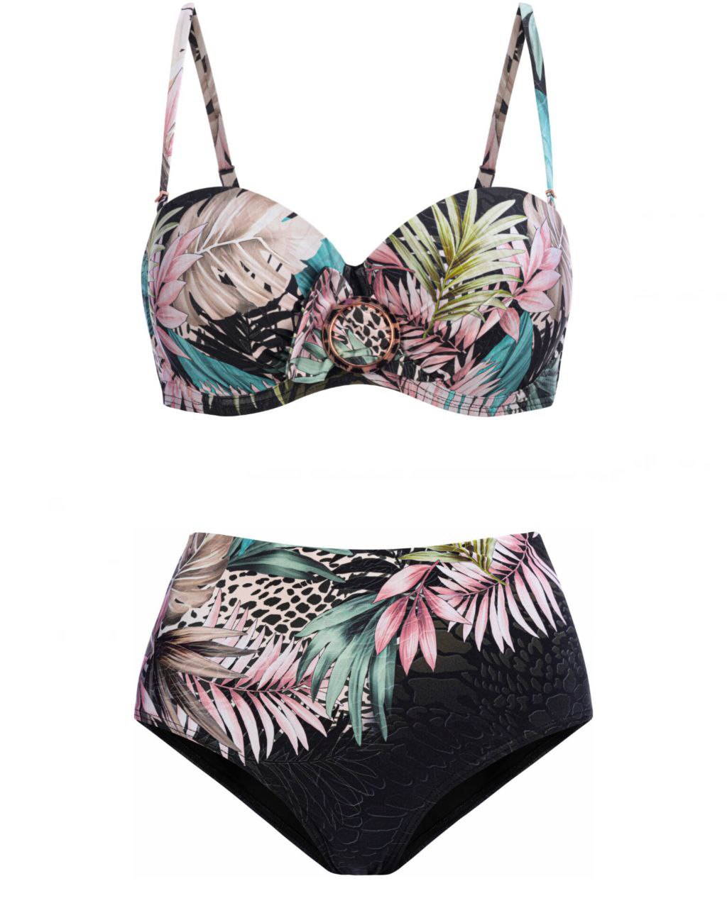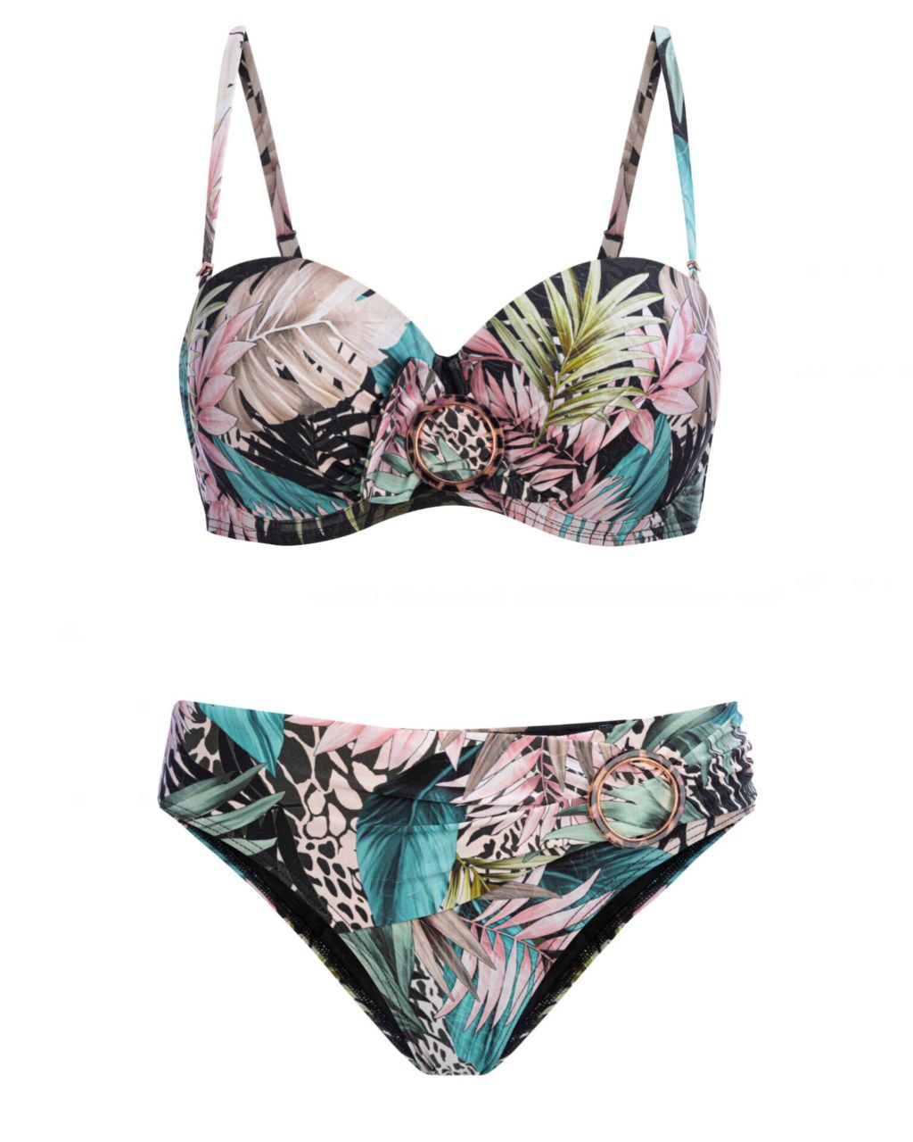 Верх купальника бандо черного цвета с принтом, на косточках с формованными чашками. Съемные вкладыши пуш-ап приподнимают грудь. Благодаря силиконовой ленте по внутренней стороне выреза, верх купальника плотно прилегает к телу. Съемные бретели регулируются по длине. На спине застежка. Декоративная пряжка спереди. Низ купальника: 1.Плавки женские классические черного цвета с принтом, с высокой посадкой. Классический вырез по линии бикини. Плавки продублированы подкладкой.2. Плавки женские классического кроя черного цвета с принтом, со средней посадкой и декоративным поясом. Полностью продублированы подкладкой. Классический вырез по линии бикини.