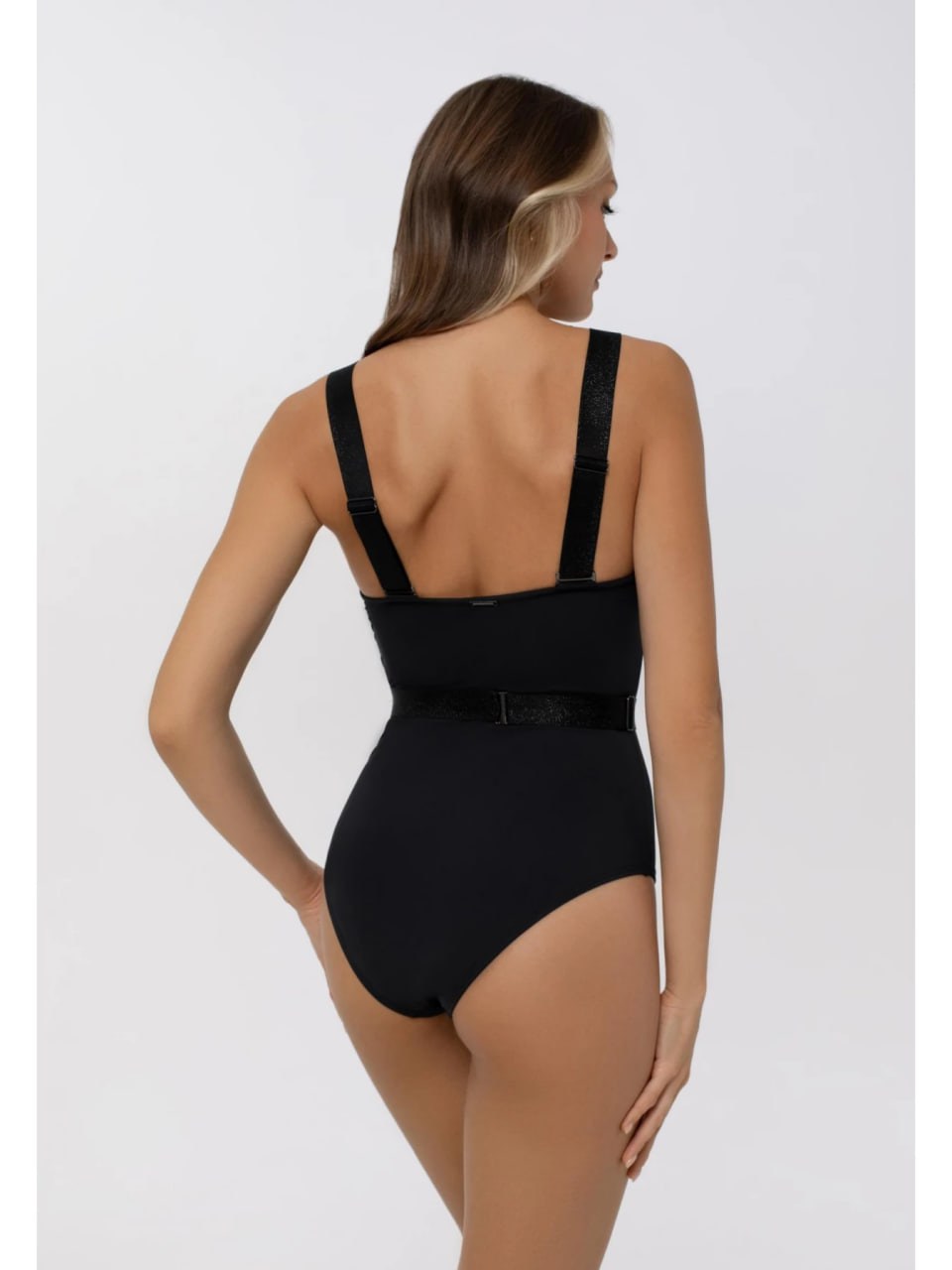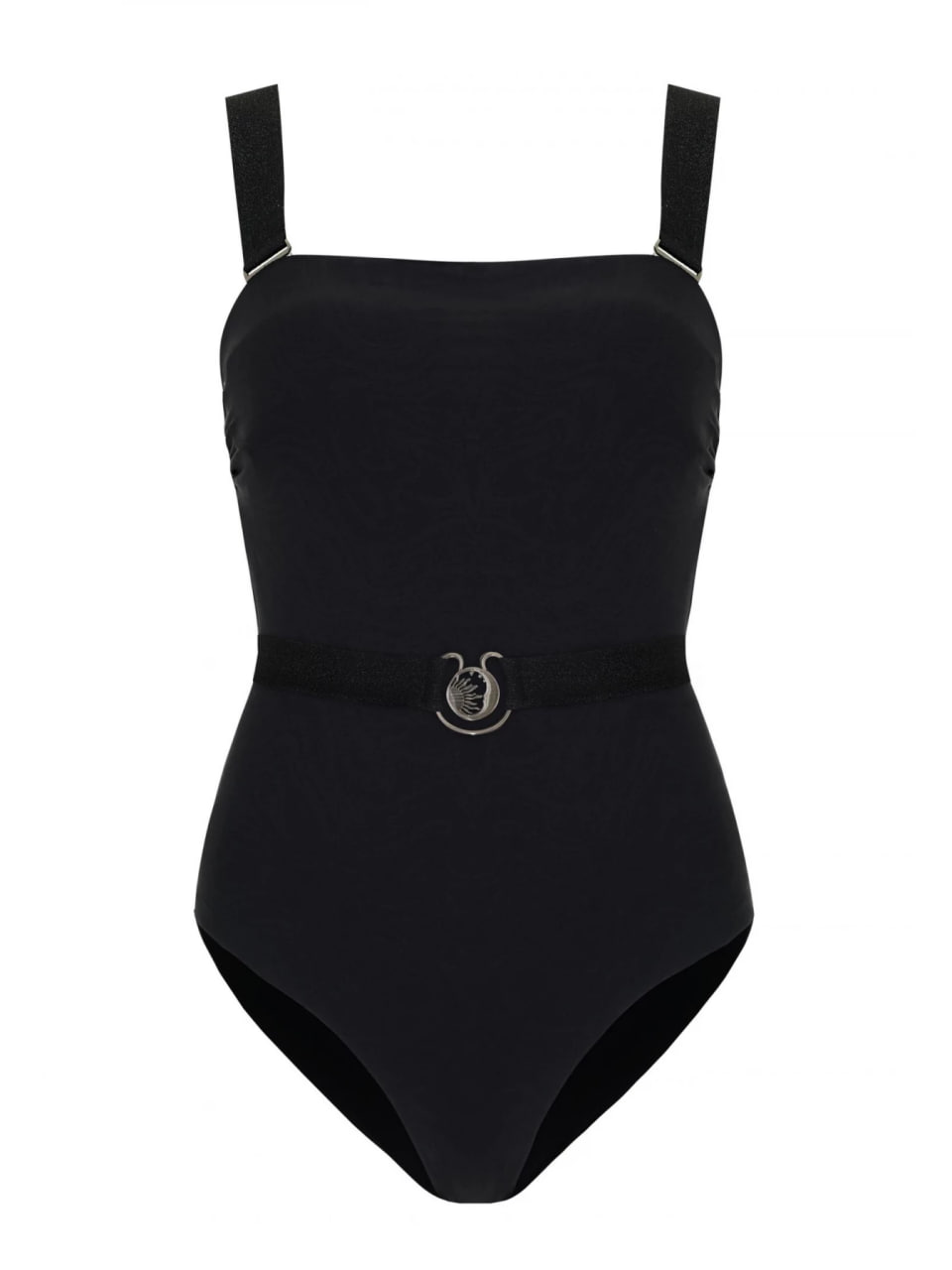 Сплошной купальник с мягкими чашками на косточках — анатомическая точность кроя и деликатная поддержка. Тонкие съемные корректоры — персонализируйте объем и форму без компромиссов. Эластичная тесьма с мягким мерцанием — добавляет ноту загадочности, перекликаясь с блеском воды. Крупные металлические аксессуары с таинственными символами — съемный пояс-трансформер, который можно носить как украшение или элемент стиля.