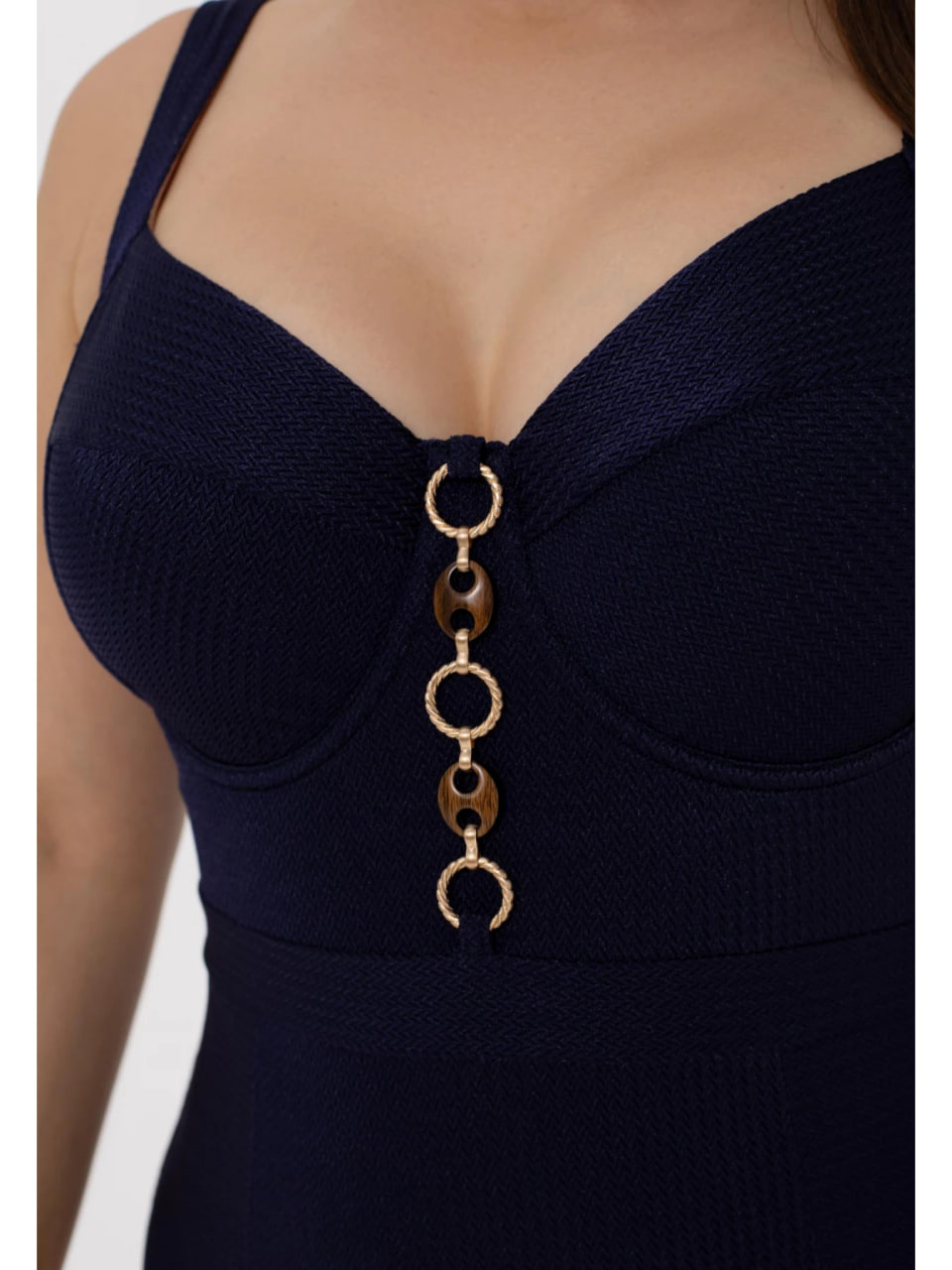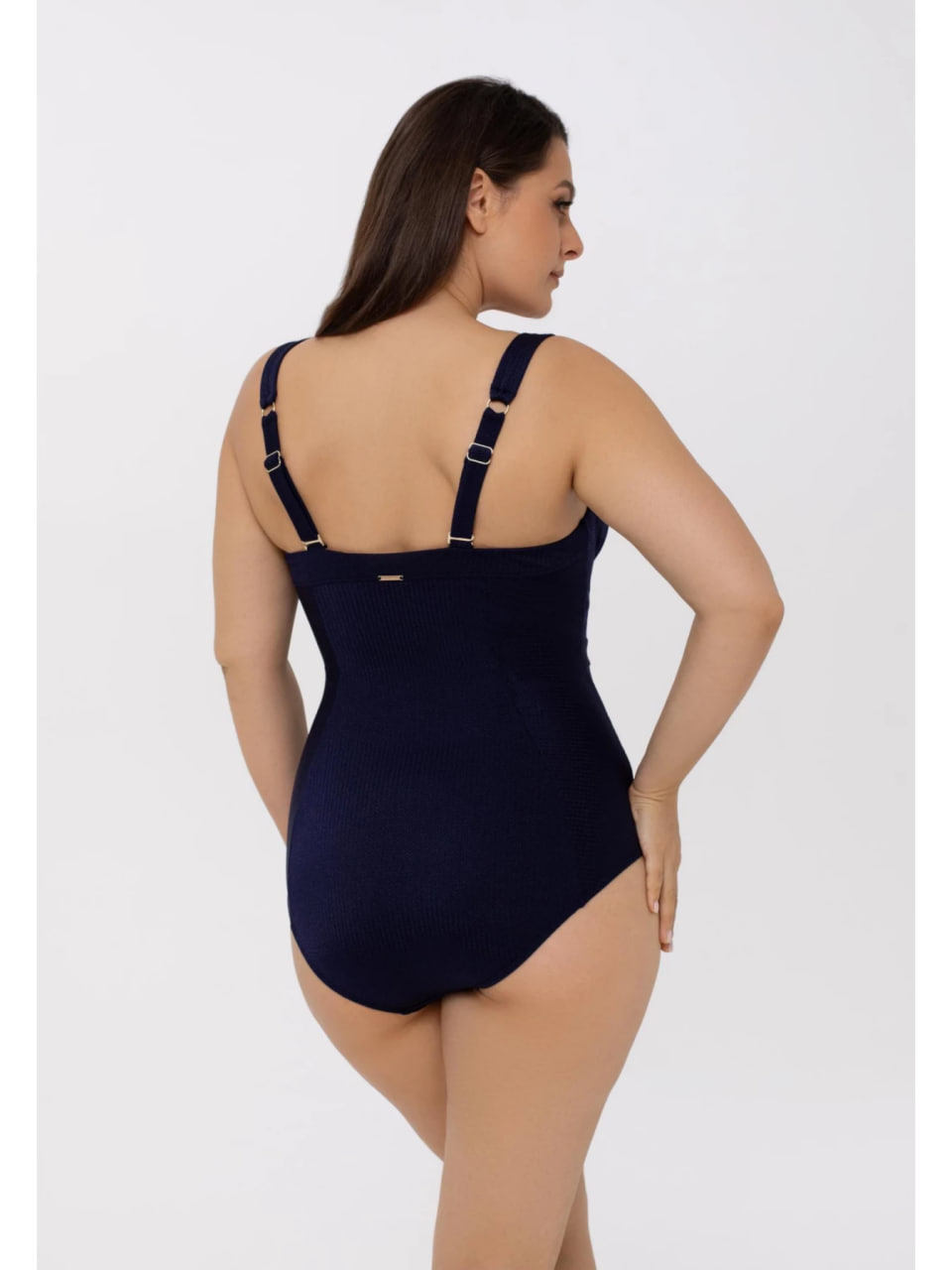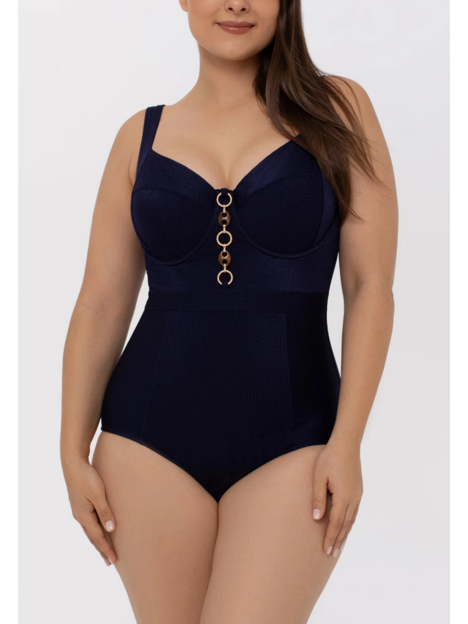 Купальник с мягкой чашкой на каркасной поддержке. Внутри чашка дублирована эластичной сеткой для лучшей поддержки. Широкие регулируемые бретели фиксируются на спине. По передней детали аксессуар.