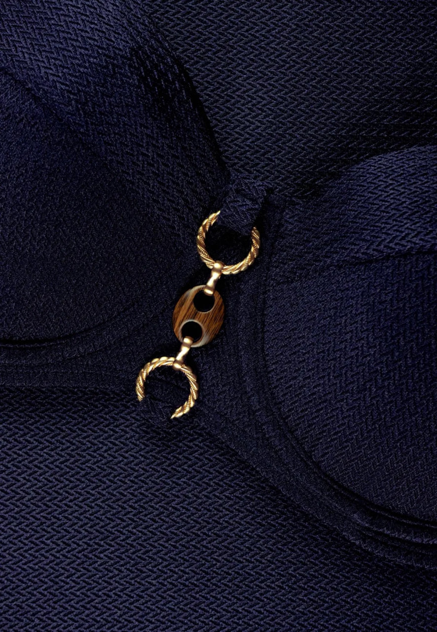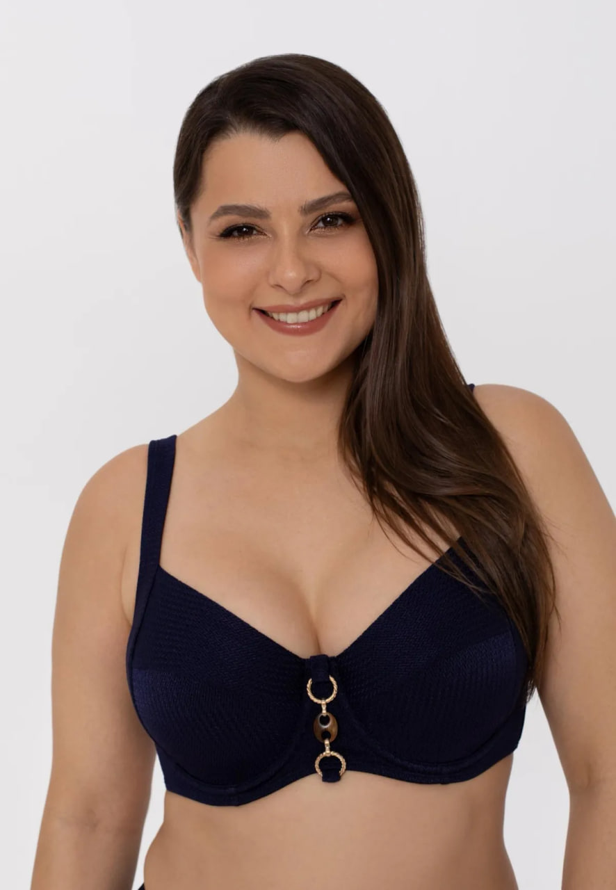 Мягкая чашка на каркасной поддержке. Внутри чашка дублирована эластичной сеткой для лучшей поддержки. Подойдет обладательницам пышных форм. По центру между чашек аксессуар. Широкие регулируемые бретели. На спине застежка
