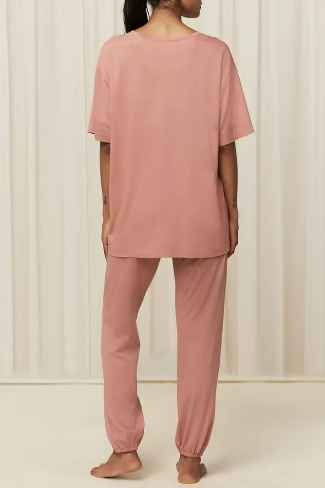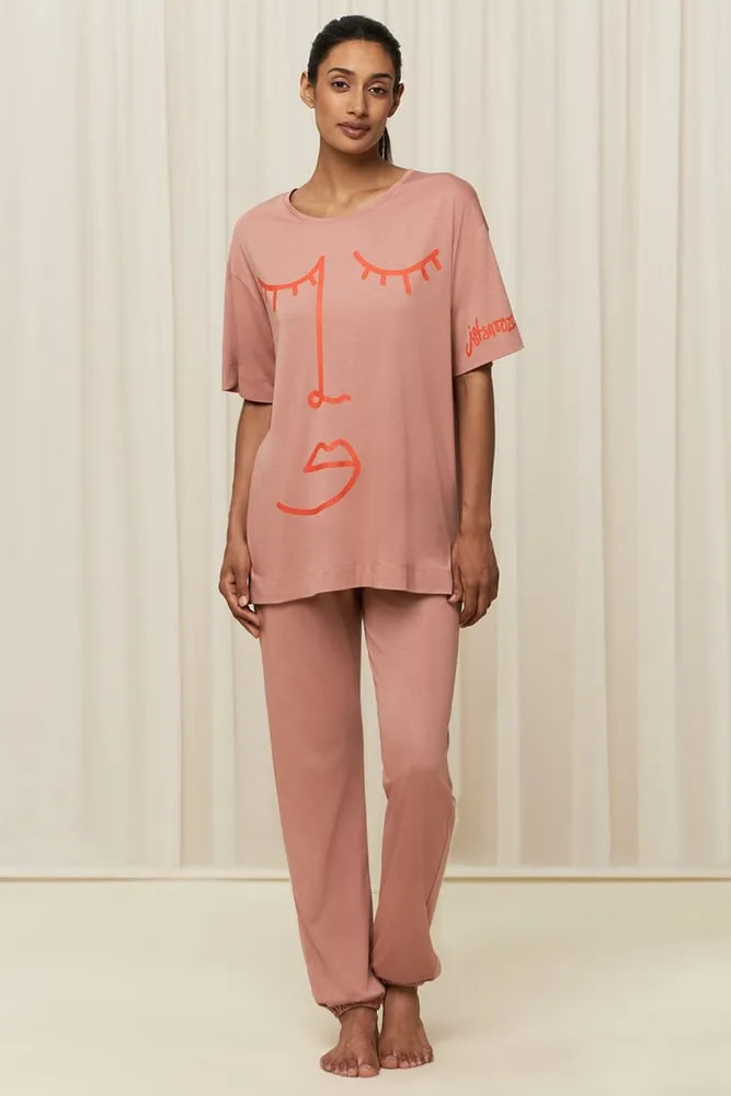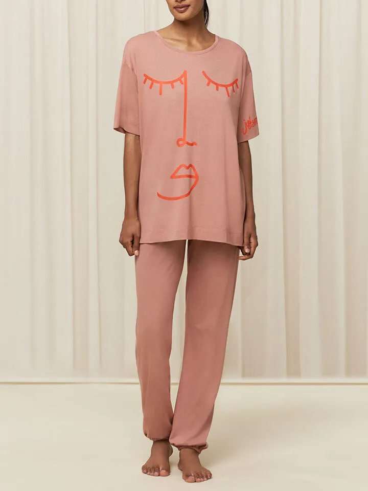 Женский пижамный Комплект Triumphсвободного кроя с футболкой с короткими рукавами и принтом спереди и однотонными брюками с эластичными манжетами.