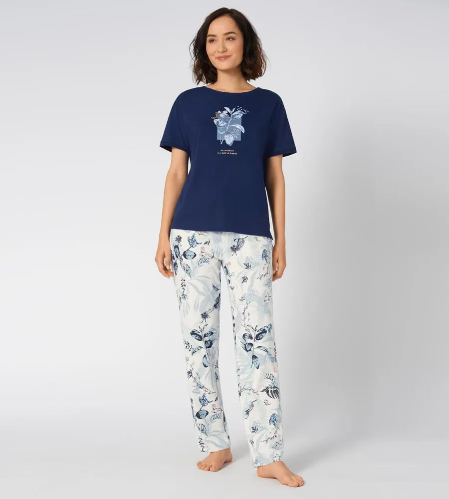 Уютная пижама из хлопчатобумажного трикотажа: гладкая блуза с коротким рукавом с принтом на груди и длинные набивные брюки прямого кроя . Мягкий пояс на резинке с кулиской. Длина блузы: 65 см.